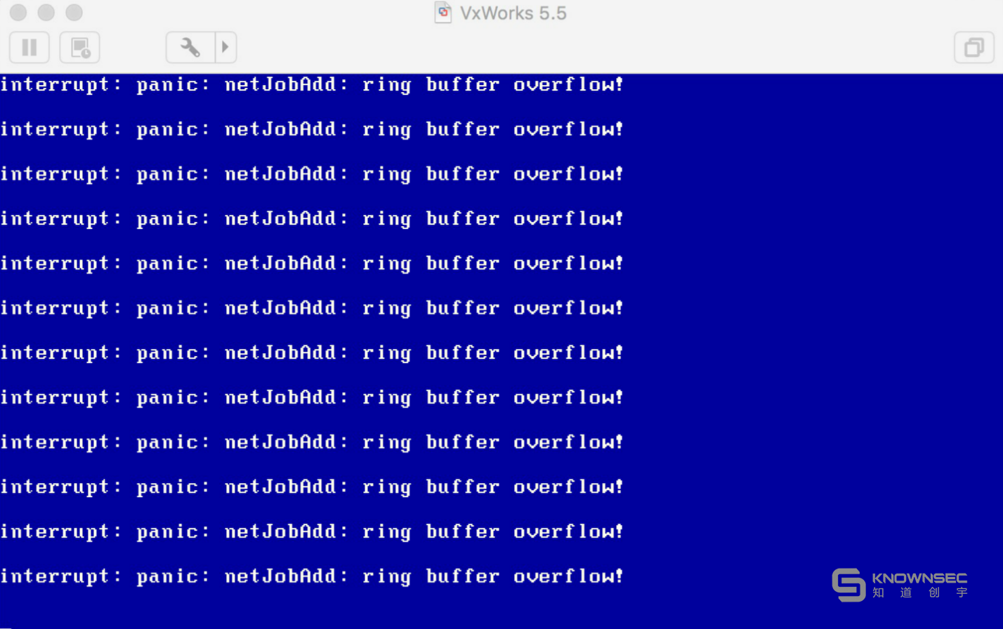 * 漏洞描述:某些5.x版本的VxWorks系统在短时间内接受到大量的网络数据包,会造成网络栈崩溃,导致VxWorks无法再与外界主机通信。在部分情况下,终端会给出错误信息,报错信息如下图: