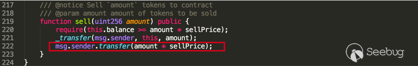 In Figure 4, we show the vulnerable sell() function that has a similar logic, The transfer balance is determined by the multiplication of amount and sellPrice, which may lead to an overflow because of the simple math operation used in line 222.